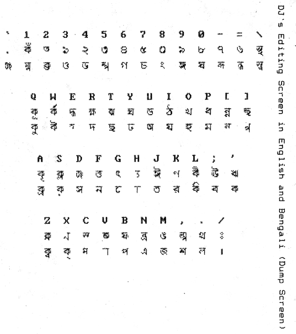 The Munier-Optima Typewriter keyboard, once the ubiquitous overlay especially in government offices, was a matter of interest with me back in the mid-1980s, but I never caught on touch-typing with it. The next Bengali keyboard overlay that I used to key in a character or two was of the DaungJan word processor, which offered a limited scope to type text in Bengali with a changed codepage for the Devanagari script. The dump screen of the DJ’s editing screen can be found «here» (png, 69kB).
