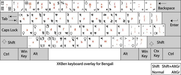 I then designed a superset of both Bijoy and Unijoy. I useed the keyboard overlay to write Bengali on Slackware and Slax. I has no dead key — the full form of the vowels are mapped on to AltGr combinations and all other conjunct characters, explicitly visible or not, are keyed in with a virama between consonants. All that is needed to do do is to copy the symbol descriptions below into a file called xkbben and drop it onto /etc/X11/xkb/symbols — on a Slackware, or Slax, machine.
